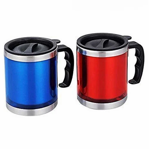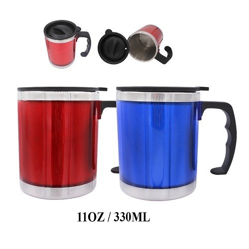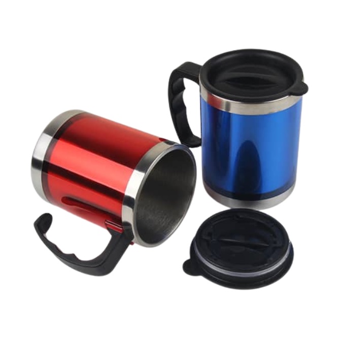 Double-walled insulated travel mug keeps beverages hot for 12 hours or cold for 24 hours. Leak-proof lid with secure closure prevents spills. Available in red and blue. Microwave and dishwasher safe. Perfect for commuters, office workers, and travelers.